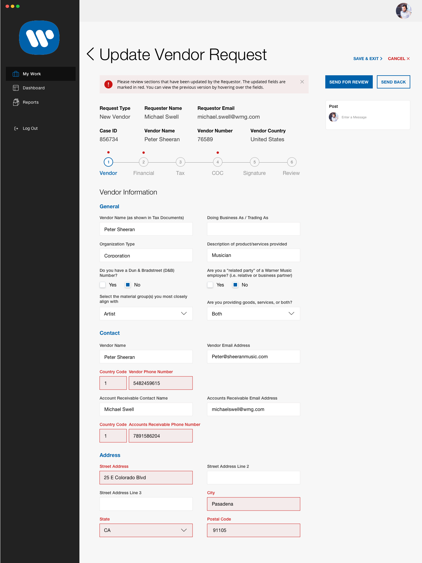 To avoid missing information and unnecessary back-and-forth communication, I created step-by-step progress for Requestor to create a new vendor. There is a progress bar guiding the users and all the fields are organized into different sections for clarity purposes.