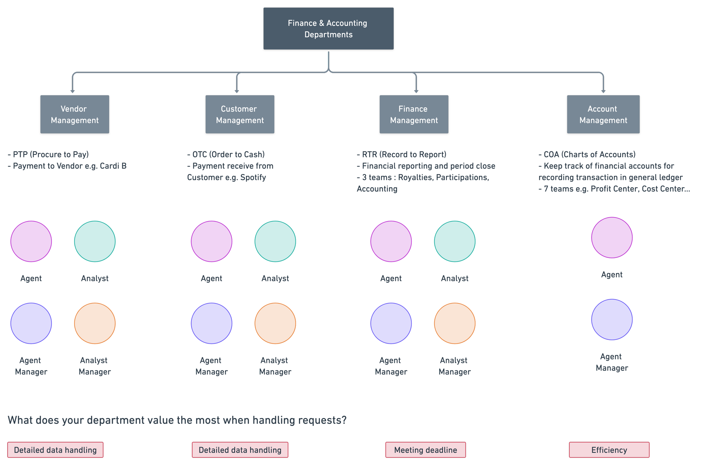 To have a deep understanding of their problems, first, I learned about the department's structure. The Finance and Accounting departments have 4 management teams. After talking to each department’s heads, I learned about the teams’ main functions and key positions.