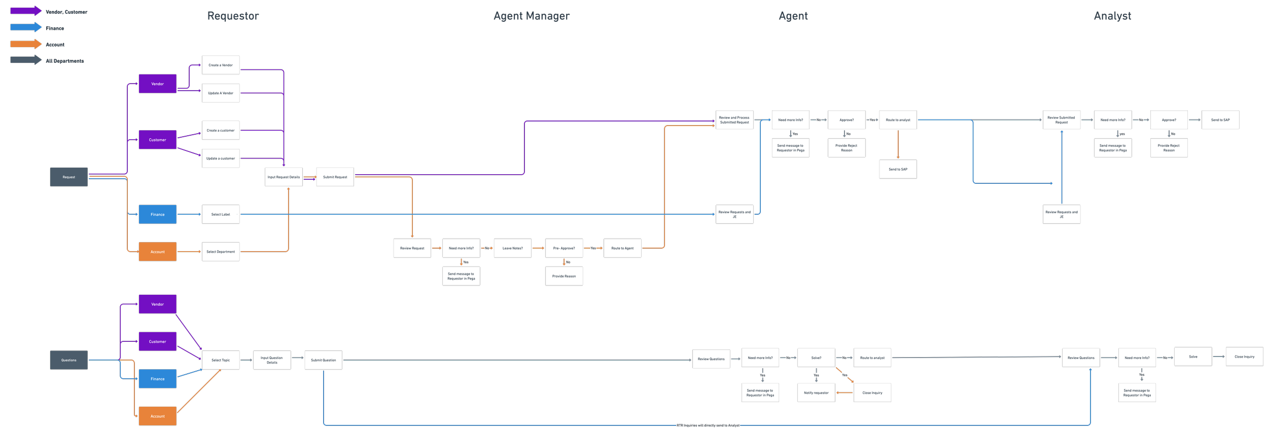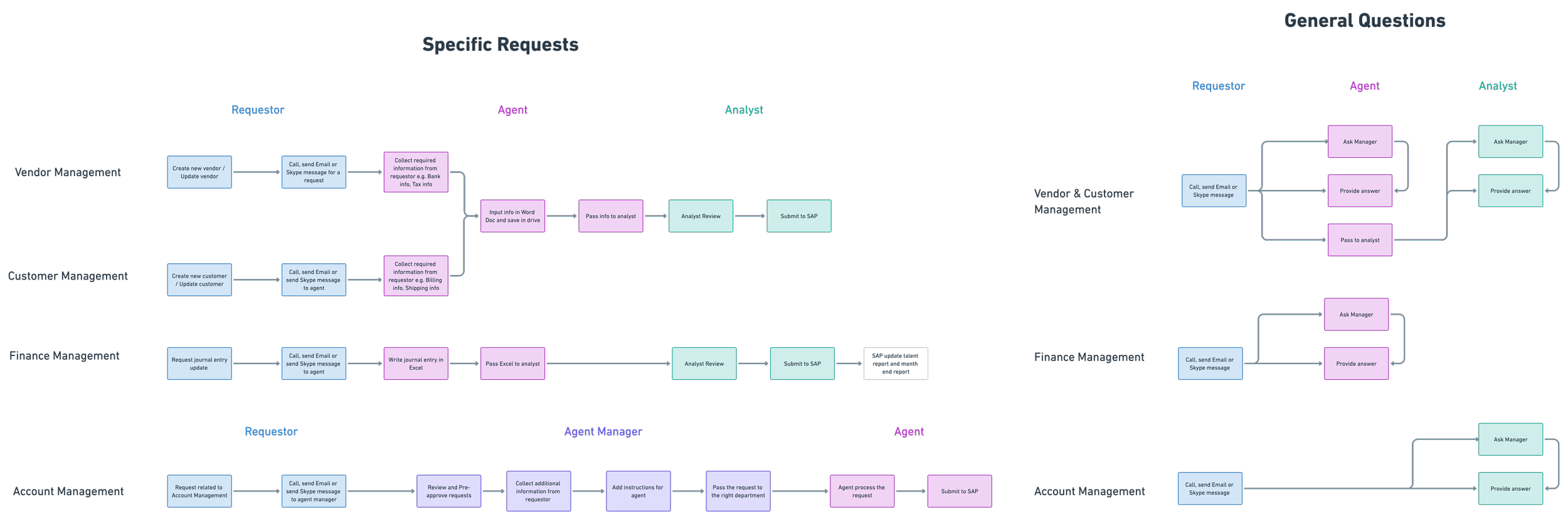 For specific requests, Vendor/Customer/Finance Management Teams have similar workflows. Requestor sends requests to Agent. Agent would process the request and hand it over to Analyst to review.