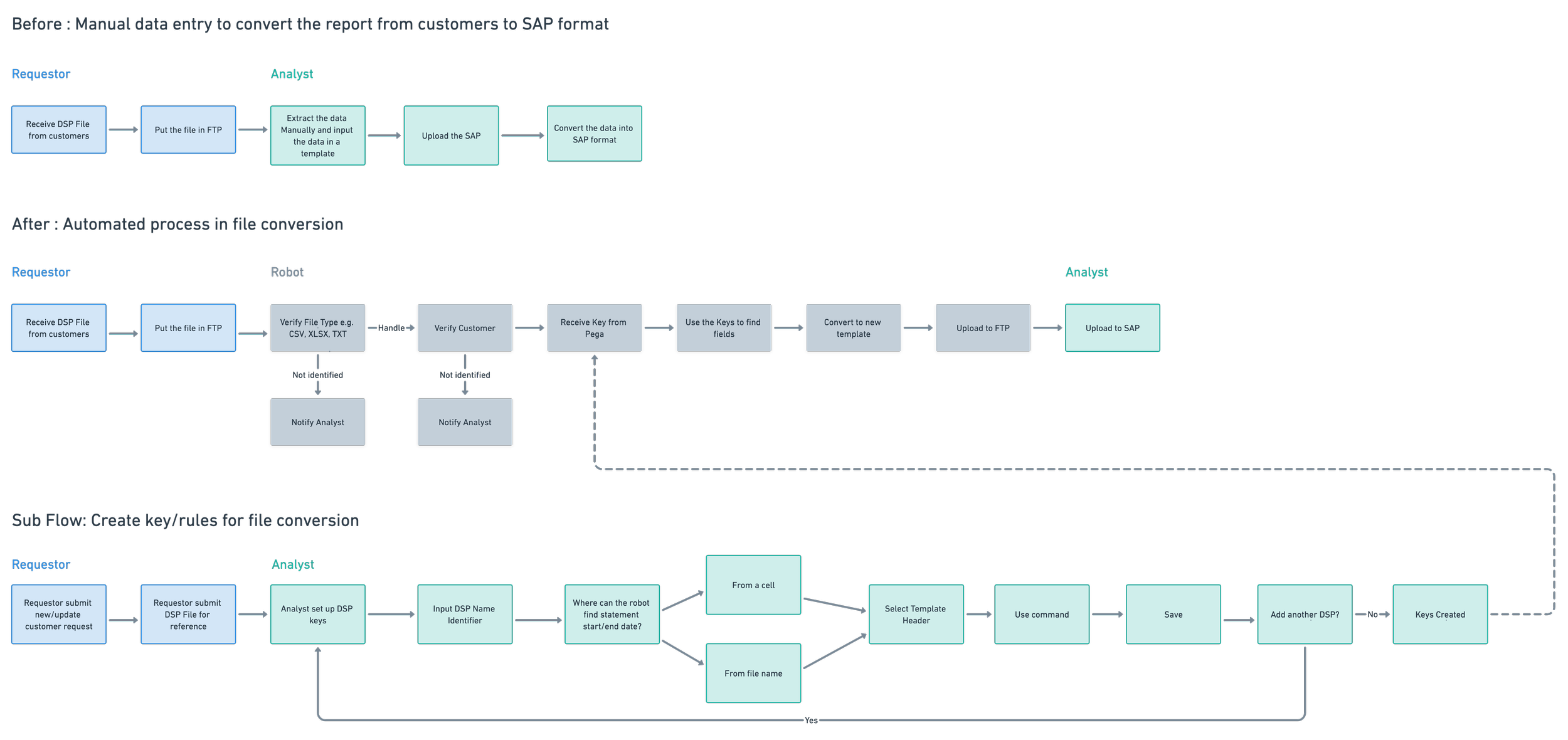 Working with the developers, I created a new automated file processing flow. Analysts just need to set up rules/keys for the file conversion at the beginning. The robot would be able to convert all the files into SAP format automatically, which would greatly reduce time and labor cost.